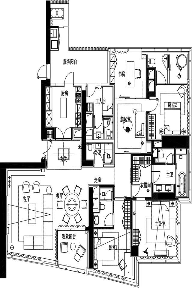 穿过走廊深入内部,功能厅、书房、主卧、次卧、客卧以及卫生间依次展开,且各个空间分区独立,互不干扰。