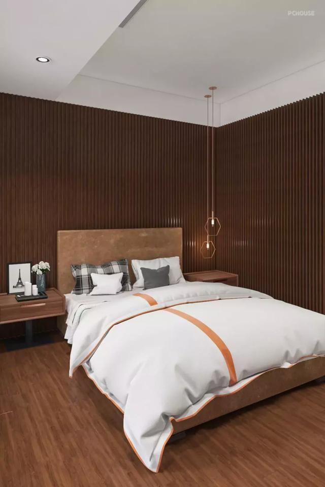 客卧以深棕色为主基调,用两面栅格替代传统的水泥墙面,别出心裁。