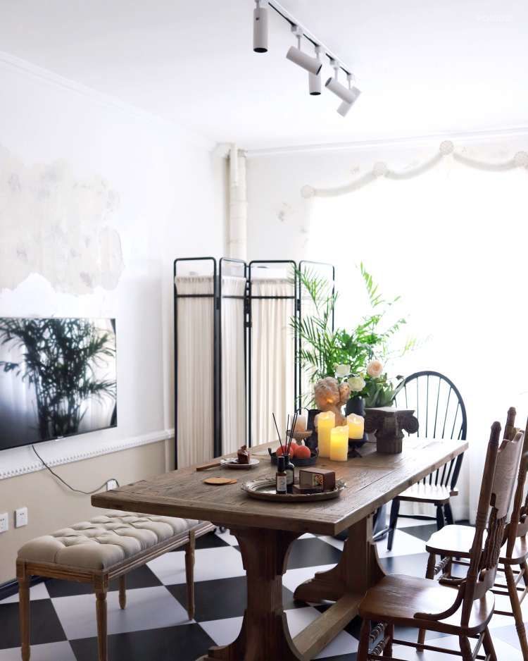 因为黑白格地面在视觉上有比较强的存在感,整个厅的软装布置也很满,加上不想刻意分割整个客厅的功能区域,所以没有选择常规的餐厅灯、客厅灯,而用的是轨道灯,以弱化灯饰的装饰效果。电视机是原屋就挂好的,装修时没有做改动。