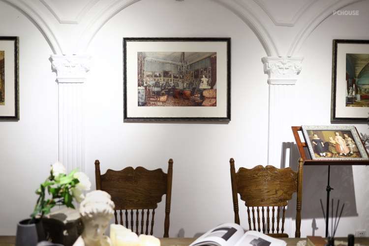 墙上挂的四幅画,是精心挑选出来的,营造出画中有画的感觉。画面颜色的饱和度较低,略带做旧感;画中的内容延续了墙面拱门的弧形元素。因为四周的石膏造型已经比较繁复,所以画框选择了比较简单的式样,但还是带了点做旧的小心机。