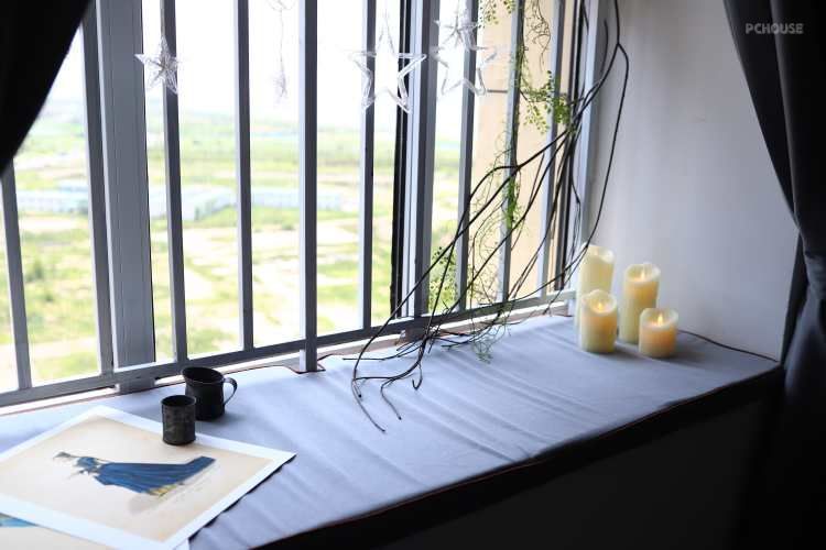 窗边的栏杆是原来就有的,特意没有去掉,设计利用来挂一些装饰品,以烘托气氛。为配合设计主题,前期把栏杆刷成了白色。飘窗垫是专门定制的,有一定厚度,舒适度满分。