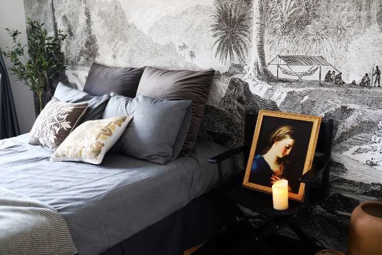 次卧也保留了老房原来的床,同样拆去了床头,用大靠枕来代替。靠枕的颜色过渡了墙面壁画的颜色,让床品与壁画更好地融合在一起。