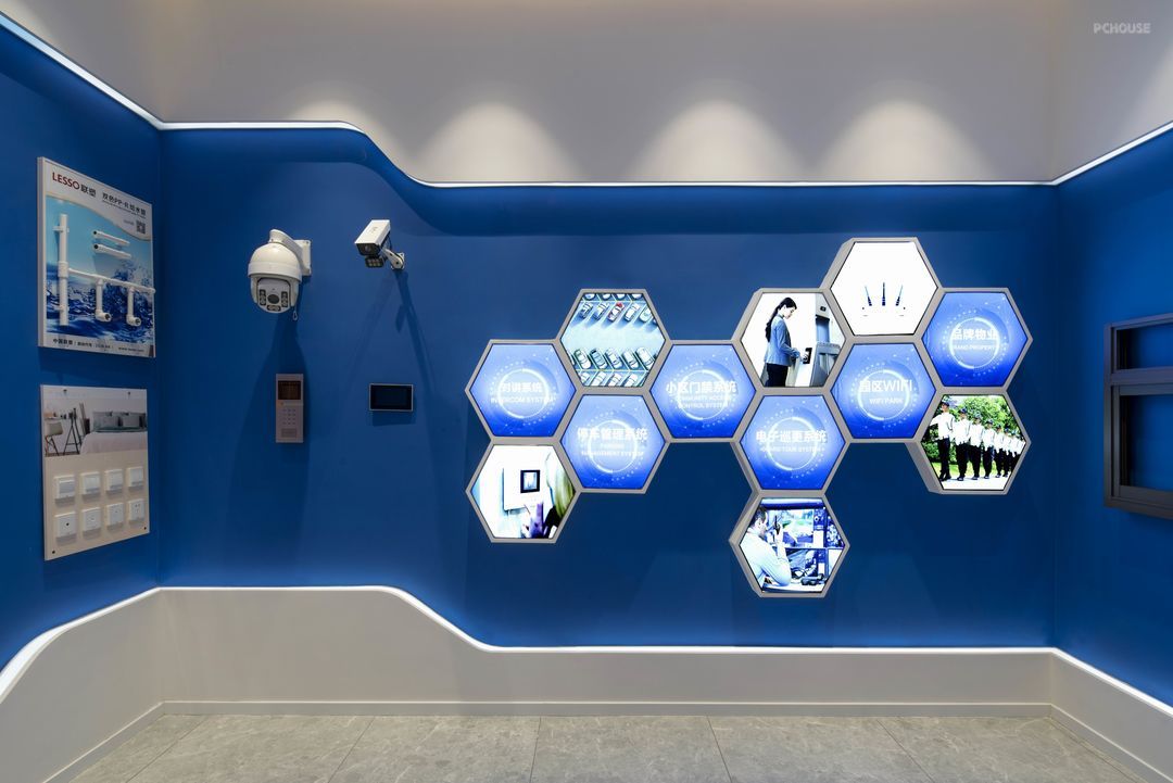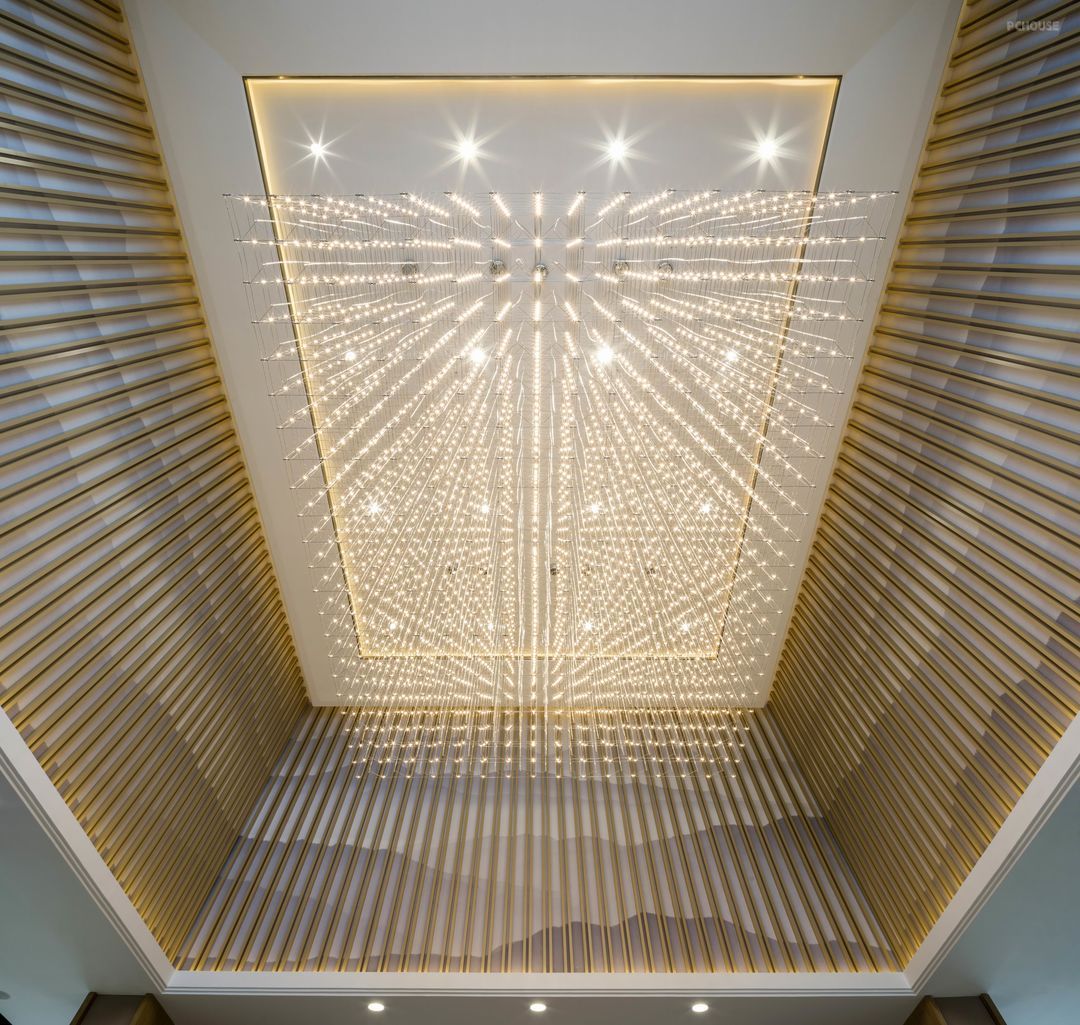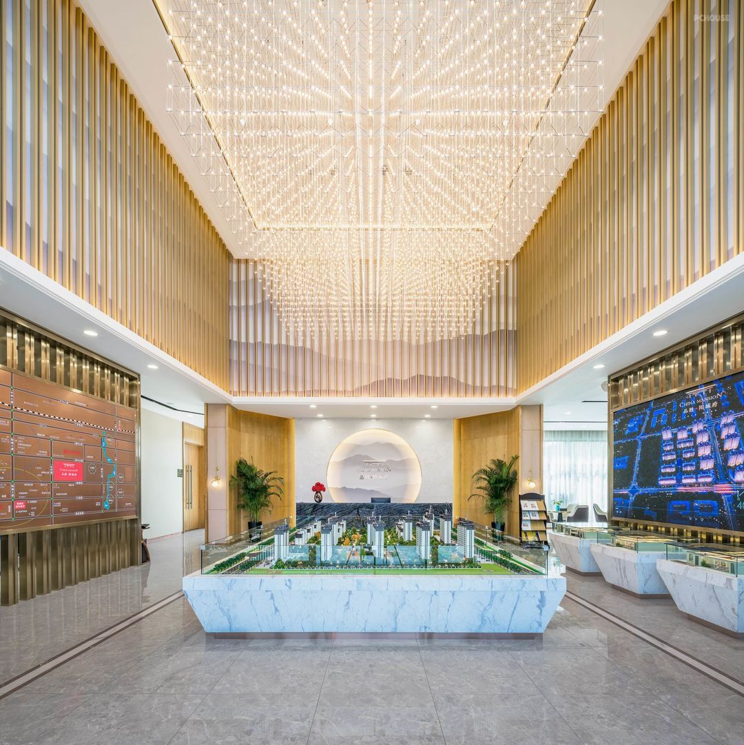 空间采用“回”字型动线布置,以传统具有仪式感的中轴对称布局方式来规划大厅空间,天地对应-天花“光立方”的吊灯与地面沙盘对应关系,左右对称-两边区位图与宣传大屏幕隔断墙的对应关系,主动线与副动线自然流畅,整体空间形成围合环抱之势。