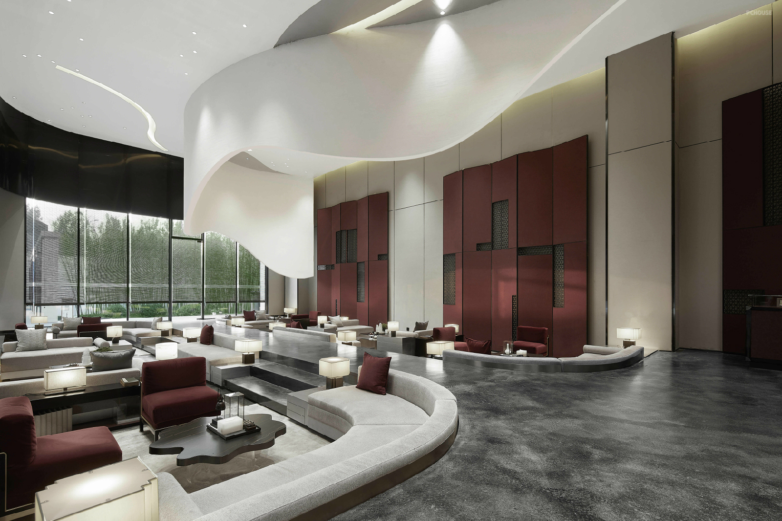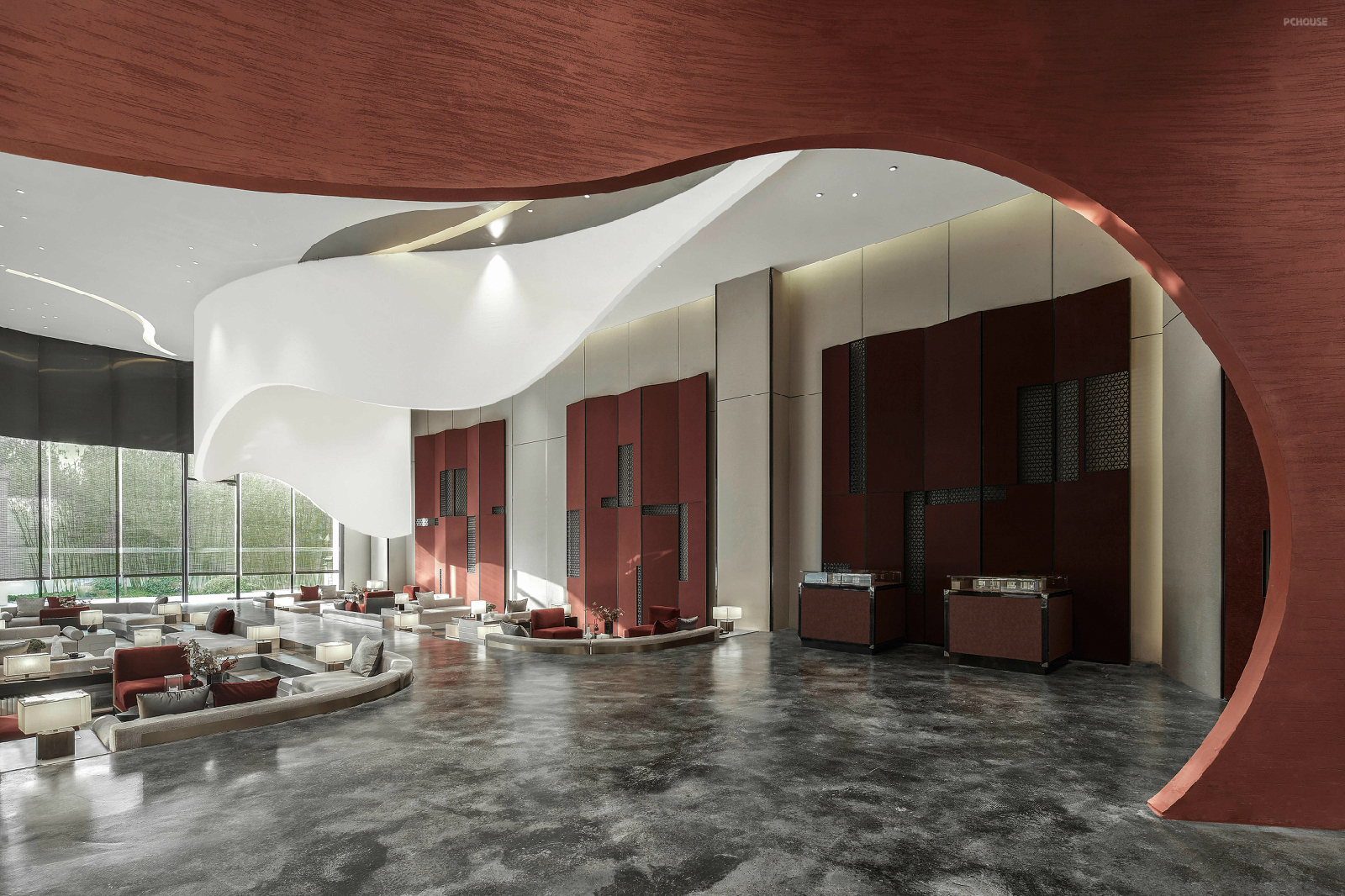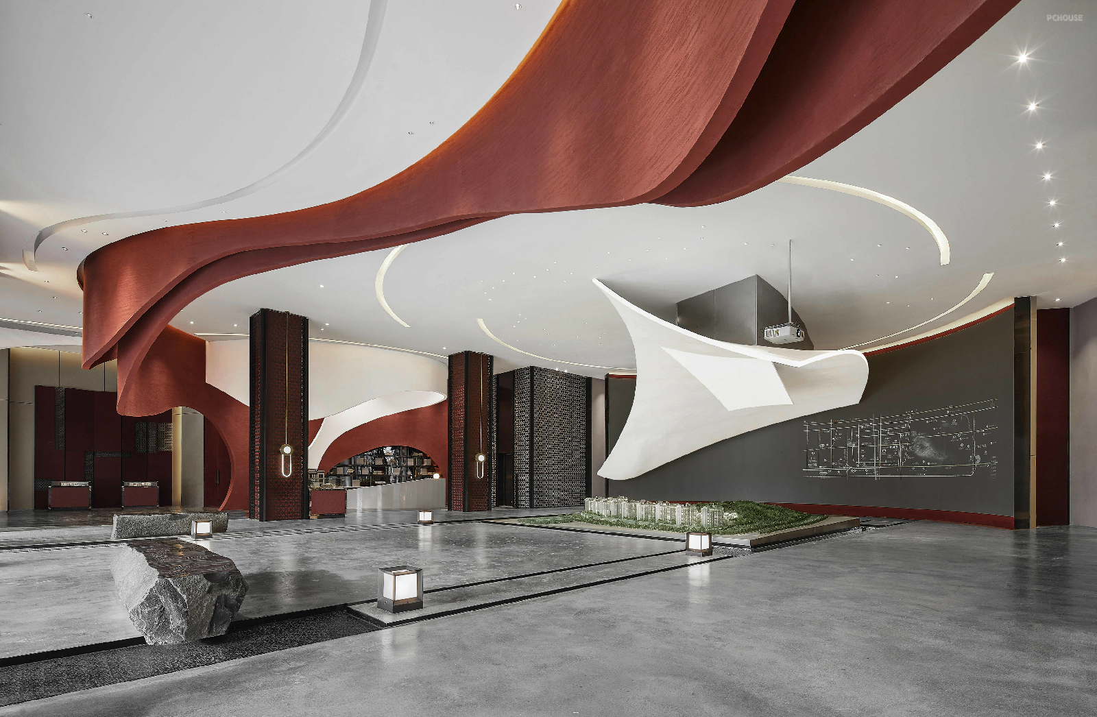 前言: 华美炽烈的绛红,与纯净至简的黑白,在全新的时空维度里构成了对繁华盛世的想象。于是我们身处历史的璀璨星河中,瞭望一页盛唐景象。 贞观元年,天下十道,开启了后人对于太平之治的未来视角。线条勾勒出一个全新的时空维度,红与黑的搭配,俨然皇室贵胄的优雅与华美。 每一细节处的精致装点,都演绎着那个朝代至高审美的动人心弦。曲线是流动的想象力,直线则代表着庄严的仪式感。 沙盘就置于这流动的想象与庄严的规制之中,如同一座古代城邦,随时展开一段关于繁荣富庶的全新叙事。 几何的天花造型如同历史的一页檐角,翻开了新的盛世篇章。顶部的圆形灯带仿佛星轨,在浩瀚宇宙静观物换星移。最极致的刚强与最奢适的柔软,在不经意间相遇。黑色金属网装饰着王朝的威威仪表,而丝绒沙发则给人炽焰般热烈的拥抱。古代屏风与花窗的结合,装饰着高挑的空间,将民族骨血中的高贵优雅尽情展现。波纹金属与天然石材的运用,让视觉层次更加丰富,也与室外枯山水造景相呼应,沉醉诗意。大面积的落地玻璃将庭院之景变成了一幅古代画卷。