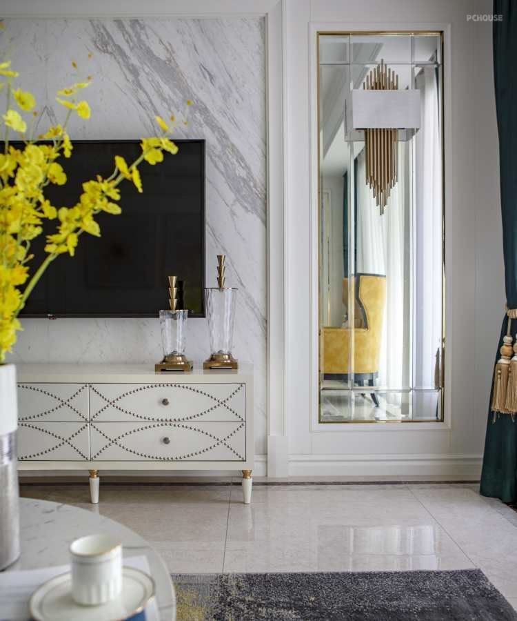 放弃了室外机平台的使用.因为不是承重墙所以把这面墙拿掉.增加客厅的采光.护墙板金色不锈钢的材质延续到了茶几灯具挂画饰品上.整体配色使用了比较活泼的邻近色