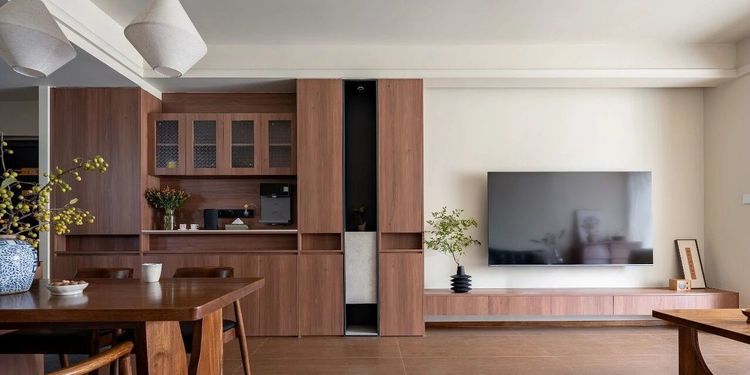 ▲改造后户型问题:1.套三变为套二,将一件次卧室变为衣帽间。并且,由于业主对主卫需求较弱,所以将主卫墙体内移,增加主卧空间。2.厨房调整为开放式厨房,增加吧台位置。其中一部分墙体为承重墙,于是设计师将其设计为冰箱置放位置,并用柜体将其包裹。视觉上与开放式厨房更融合,功能上也多了一定的收纳性。3.客厅和阳台连接为一体。