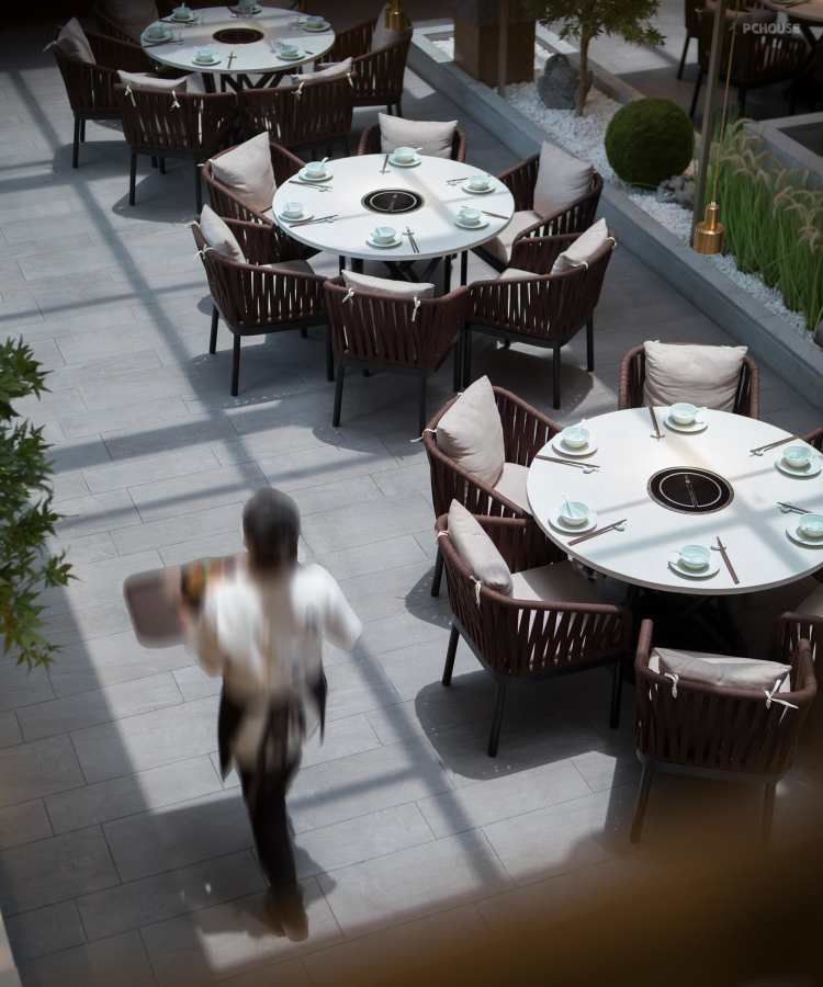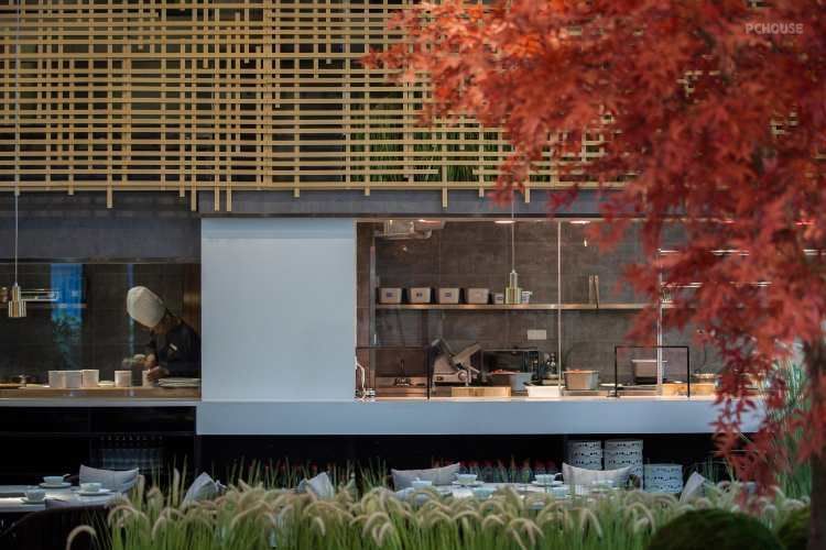 “拈菜”的logo图案是筷子,这一元素在空间设计中被大量使用,被设计得更抽象、更艺术、更自然。餐厅的风格调性是休闲舒适的现代风格,设计团队希望能在繁华闹市中开辟出一片净土,为前来就餐的顾客营造出轻松愉快的就餐环境。餐厅有大量的面积在玻璃房里,基于这一点,设计团队采用庭院景观的设计手法,选用园林景观设计中常用的材料,打造出在室外就餐的感觉。考虑到大量真植物的维护成本过高,且存活风险较低,选用了仿真植物。布局时充分考虑了植物的颜色、层次、高矮、疏密之间的变化关系,使其与硬装造型相得益彰。