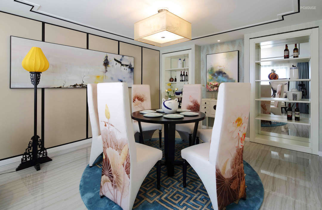 客卧室设计中式壁纸作为床头背景,配合顶面的线条,搭配白色的家具。