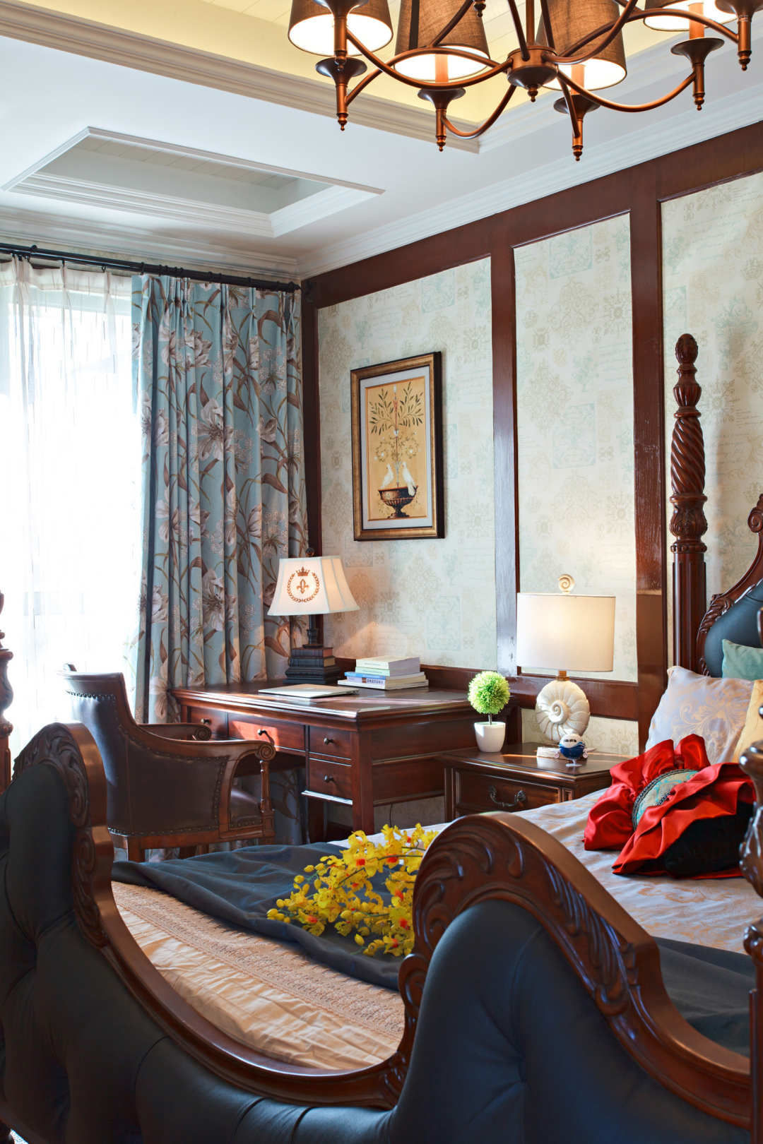 在利用宽度确定好电视墙后,在另一面主墙上设计书柜和壁炉,丰富墙面功能。