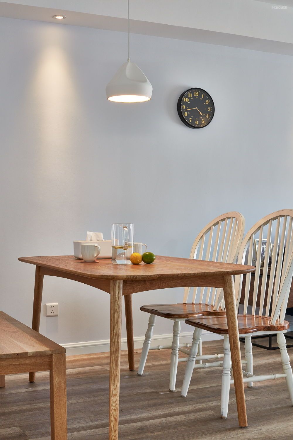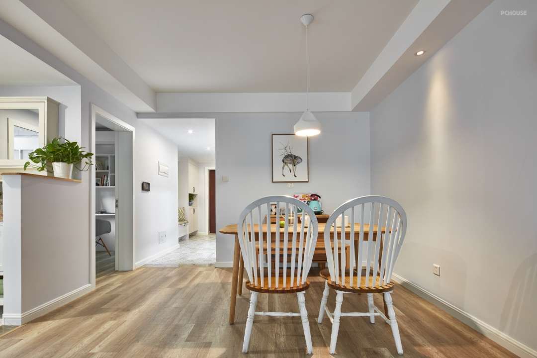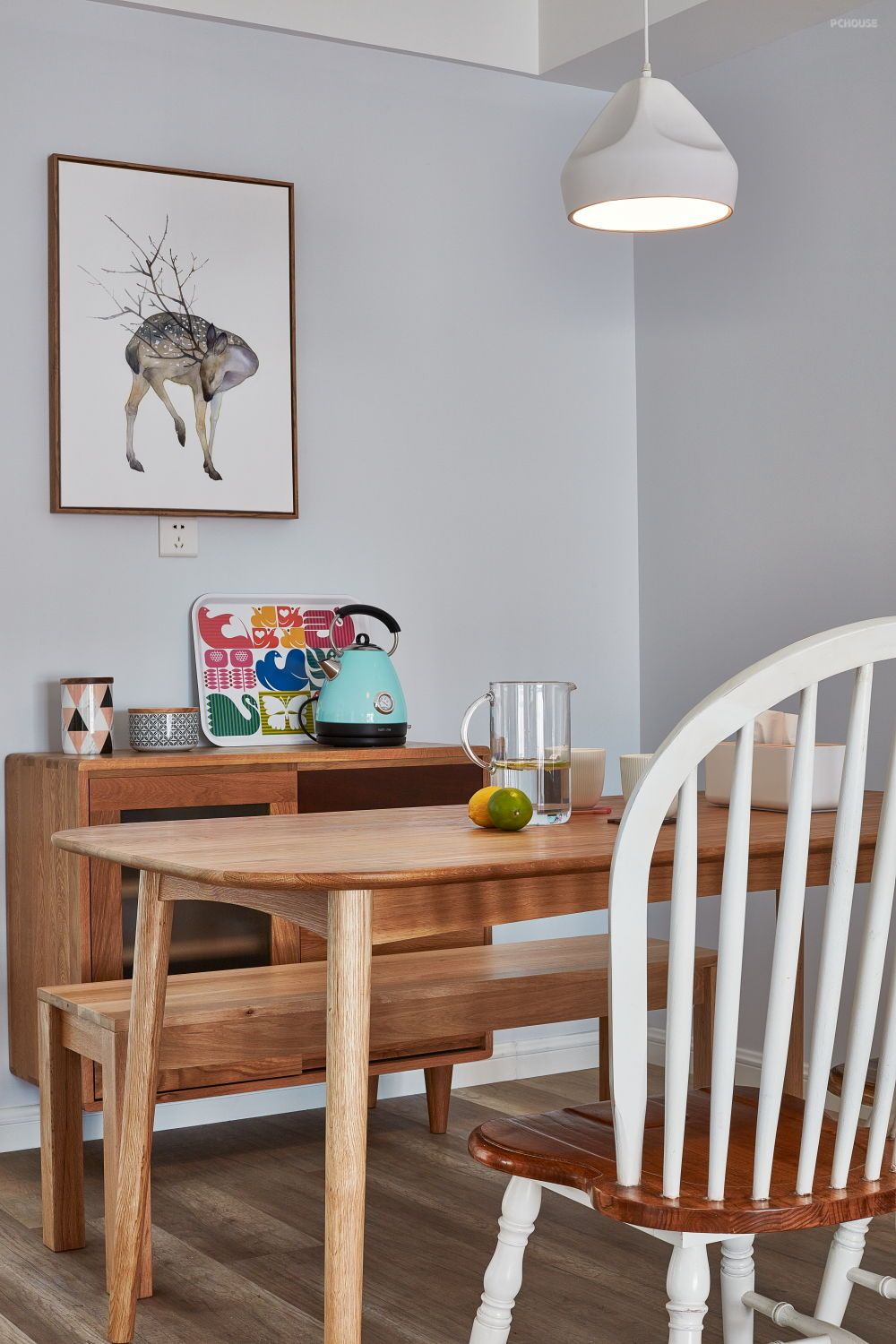 餐厅与客厅之间没有刻意隔断,这样一来整个大空间显得更为通透明亮。纯色的空间背景色下,设计师着重表现原木色系的自然张力,以极简北欧家具的原生态线条完满空间的弧度美。 #餐厅