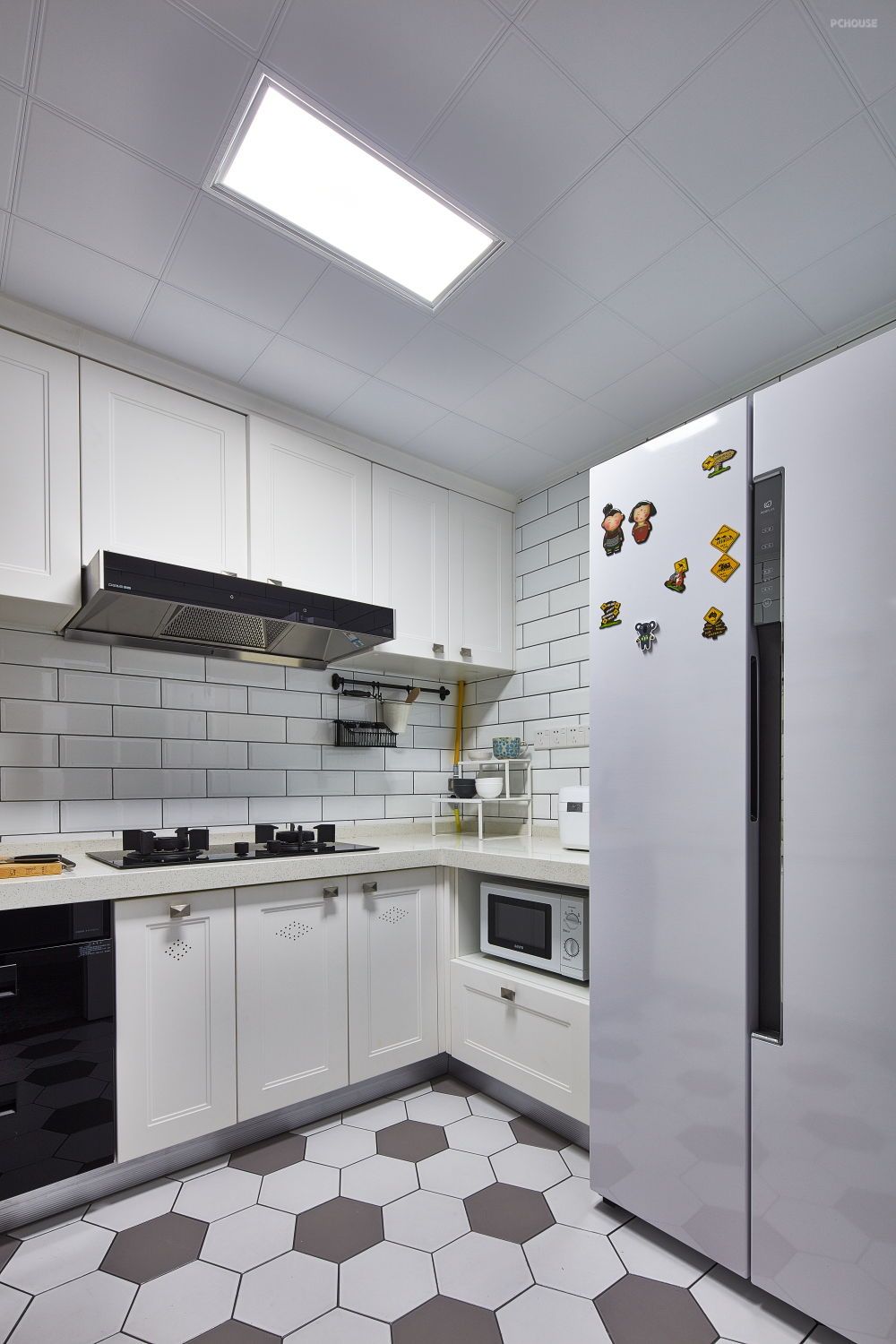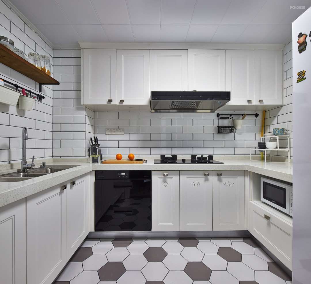 由于厨房为暗厨,本身没有采光窗,因此整体空间以文艺白为主,缀入高级黑,同时以六边小花砖来提亮空间。 #厨房