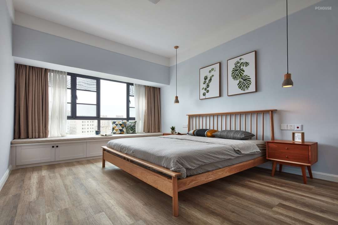 一派舒适的木地板,两幅植物挂画,床头两边各一盏文艺感十足的水泥吊灯,没有繁复的色彩,没有多余的装饰,设计师以极简的笔触为屋主打造出一个真正意义上回归初心的休憩之地。 #卧室 #床