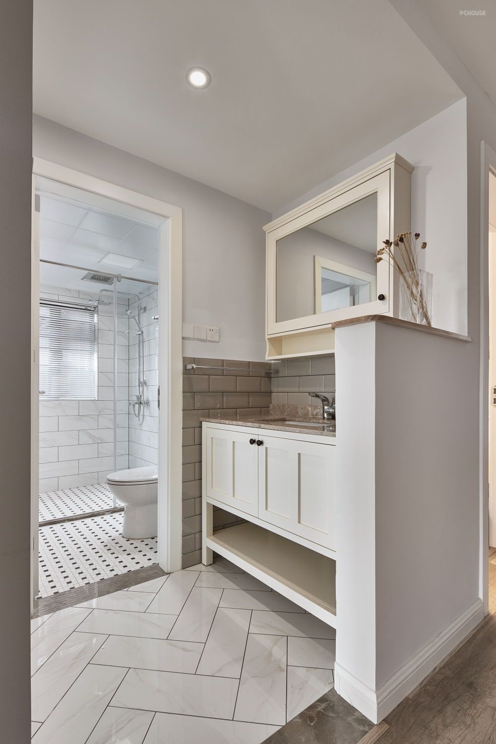 原本不大的卫生间通过改变次卧开门的方向增加了独立的盥洗区,洗手台外置、干湿分区的设计更贴近生活需求,设计师通过不同色系、材料的使用,完美再现极简风格的纯净与素雅。 #卫生间