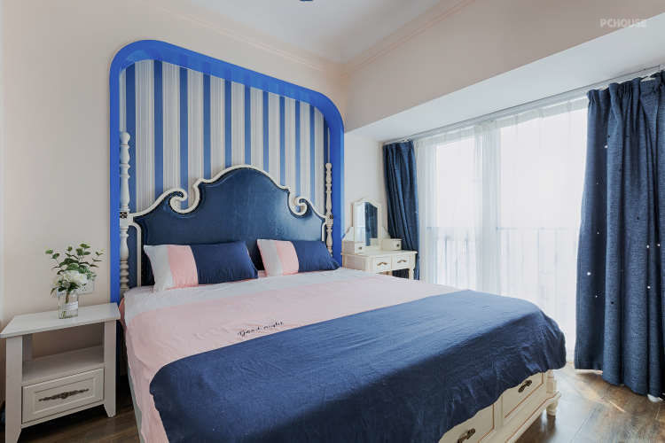 主卧原背景墙面,对齐大横梁有个凹位,将凹位左右对应补平,中间不变,将床头内嵌,解决了横梁的问题,床内嵌节省了空间,留够床尾通过的距离。大梁底部正好放置梳妆台,避免床压于梁底。