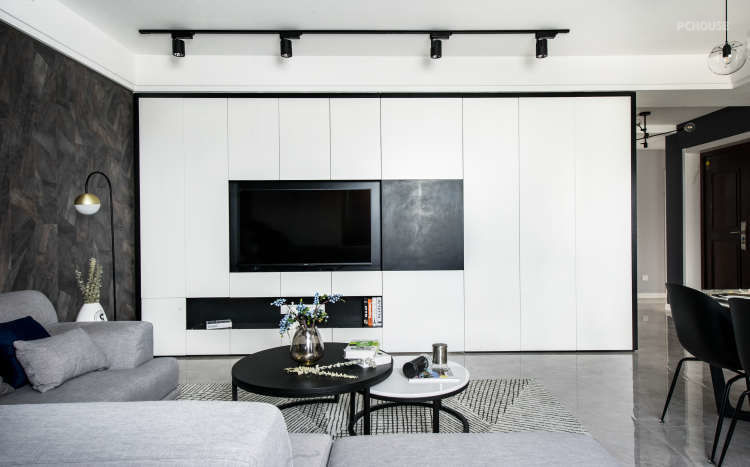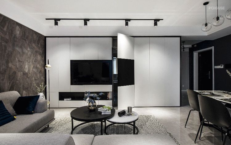 一整面电视背景墙,承担了关联、延伸、分割,远看是造型,设计师实际上“隐藏”了小惊喜。墙后另有玄机,墙上有一扇黑白隐形门,进门便是一个隐藏的卫生间,既不影响实用,又使电视墙更加大气,利利落落的墙,变成了一道景观。