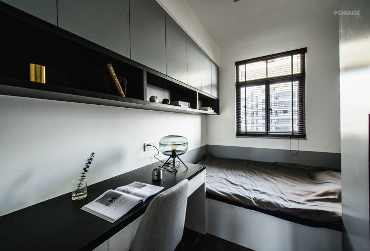 客房榻榻米的打造,扩大了储物空间,墙上静默的深灰搭配黑色的柜子,平衡了视觉效果,搭配着光影的变幻,前卫的高级感立刻凸显出来。