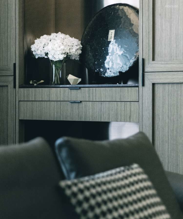 这次项目的男女业主就是如此。由于以往居住的房子都是以深色调为主的中式风格,时尚的女业主希望这一次能以现代风格为主调,而她个人也偏爱华丽的视觉效果和白色。另一方面,事业有成的男业主则喜爱沉稳的深色调,平时爱好茶艺的他,希望整体的设计风格能融合他的个人喜好。
