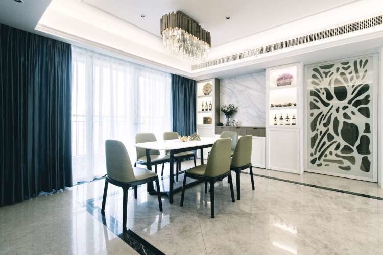 餐厅摆放了长形的大理石纹饭桌,与客厅大理石茶几呼应,橄榄绿的皮质餐椅也与客厅沙发质感呼应,家具的调性整体统一,视觉上更简约。