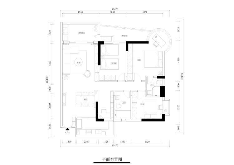平面布置图,户型上没有做过大的调整,靠近厨房的小阳台空间给到了厨房使用,增大了厨房的空间,从书房与餐厅之前承重墙延生出来一个矮柜隔断,让空间增加高低错落感。增加了很多储物柜的设计,满足业主对储物空间的需求。