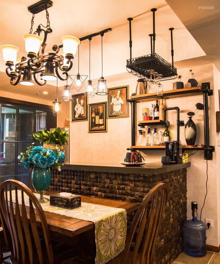 餐厅的设计是一大亮点,与餐桌毗邻的是一个mini小吧台,虽小但也是五脏俱全,偶尔空闲时为自己磨一杯香醇的咖啡或是一时兴起为爱人精心调制一杯颜色斑斓的鸡尾酒,也不失为生活的一种乐趣,置物架的木料与黑色管道,更为空间增多了一丝工业的气息,特别却不突兀。