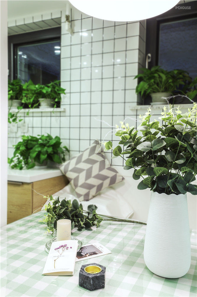 餐桌的背景墙选用色块拼接处理,给用餐环境增添些趣味性。