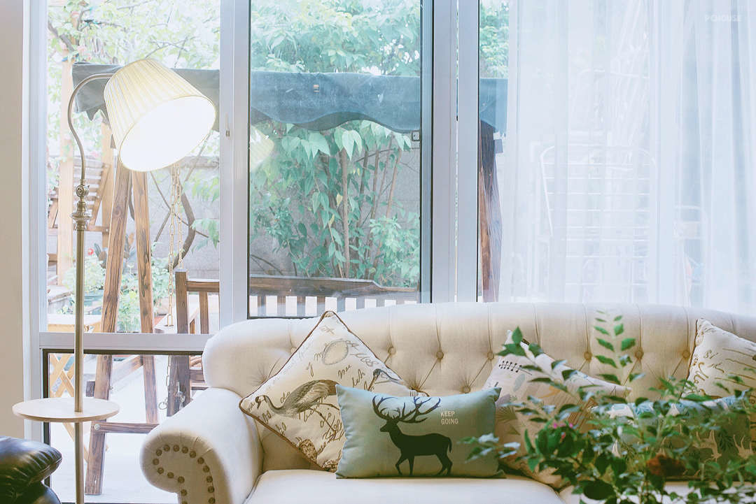 客厅背后的超大落地窗连接着户外花园,采光极好,想想每个明媚的午后舒舒服服地窝在沙发里,美滋滋… #客厅