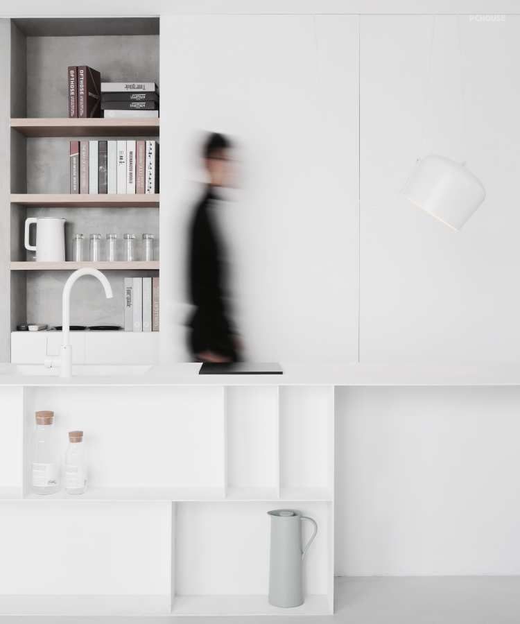 收纳空间排布在房间的四周,进门处左手边我们设置了进户鞋柜,鞋柜上方则是同样具有收纳作用的木色层板,紧挨原卫生间的位置设计成洗衣和烘干的工作区域,而洗漱区旁“顶天立地”的黑色移门拉开,会发现同样是储物力max的储物空间。白色中岛,可以存放大量物品。而书桌工作台所咬合的墙体,结合原有承重结构柱设计出开放的收纳空间。为充分利用空间,巧妙地将书架盒设计在地面与天花顶面,同时将空调也隐藏其中。