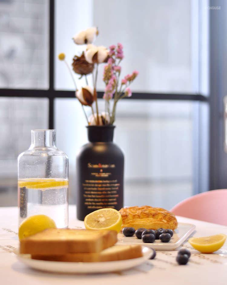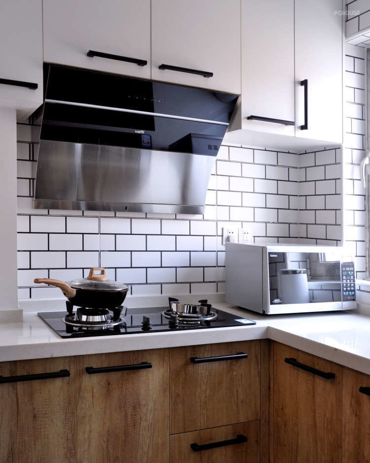 一层平面布置图首先改掉了楼梯的方向,整个二楼相对来说会比较私密独立,楼梯下方的空间也可以作为储物柜来使用。厨房做成了半开放式的,保持了通透和采光,同时也避免了最担心的油烟问题。门厅加入了一个小玄关,阻挡了卫生间正对门的问题,后期业主怕门厅显小就取消了