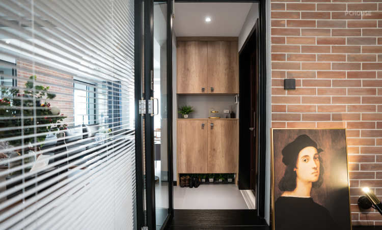 入户左手边的书房,看向玄关柜、客厅方向;书房墙面也特意做了文化石的设计,在不同空间的同一个区域能和客厅相呼应,玄关柜特地做了200mm高的抬起,配合灯带,回家后刚换下来的鞋子就可以放进来啦,避免鞋的潮气在柜子里蔓延。