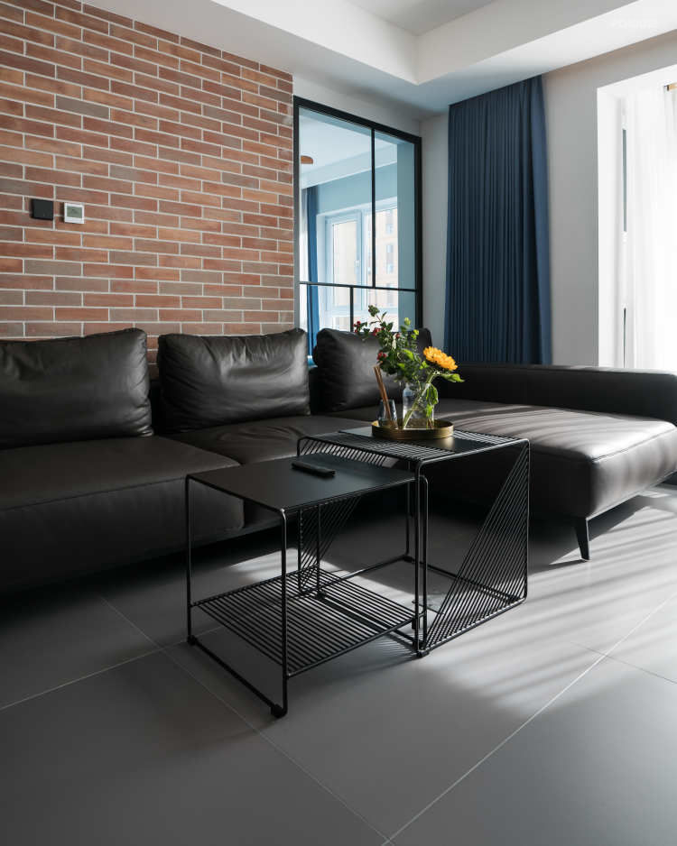 第一次勘测的时候就注意到,房子主卧的阳光最为充足,但是客厅的阳台窗户由于室外机的原因并不是很大。当时的直觉就是如果清晨第一缕阳光可以通过主卧,折射到客厅一定会有奇妙的事情发生。牛皮沙发长度3900mm,后面的墙面是原结构的承重墙,现场勘察得知两侧是同样厚度的隔墙;果断拆除;中间墙体的宽度是1700mm,红色文化石的错拼铺贴,8mm的浅灰色填缝;文化墙两侧对称的玻璃隔断外框40mm,内部装饰条15mm,是我们的设计师的原创设计哦。整个空间色调基本都属于冷色调,红色的文化石为空间增加了温度感,透明的玻璃隔断是的空间更加透亮。