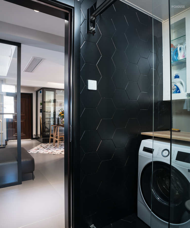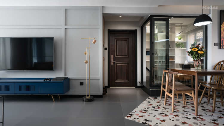 入门玄关处右手边原始结构是封闭的空间,我们将拆除部分墙体改为黑色边框玻璃隔断;长1500mm,高2400mm,增强视觉的通透性;榻榻米高280mm,折叠门的利用扩大了门洞的面积;地面玄关和客厅采用800*800mm规格的中灰色瓷砖,在与餐厅地面做区域划分时根据六角砖的几何图案做了三角斜线切割进行异形分割,打破常见客厅和餐厅的区域划分的呆板;