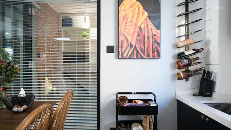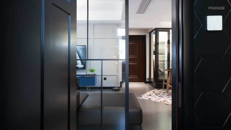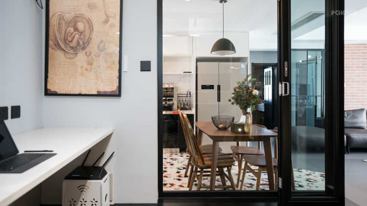 原结构封闭狭小的书房空间,和餐厅之间的隔墙打通,设计为40mm黑色边框的超白钢化玻璃,透亮大气,在视觉上扩大空间感。