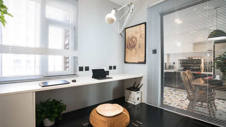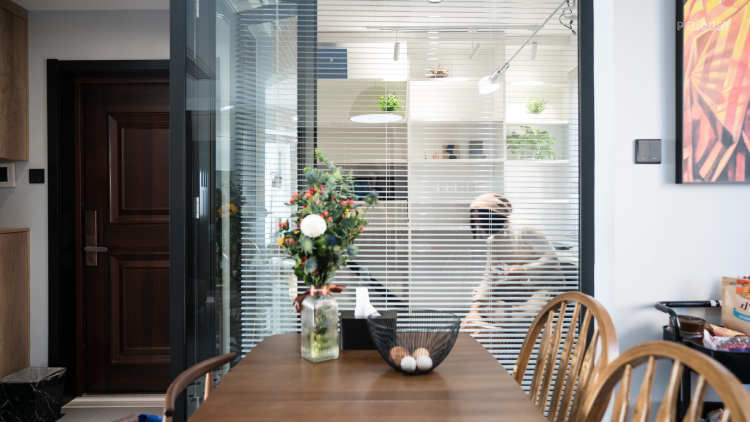 书房看向餐厅的角度,电动百叶窗完成全打开后,整个大的空间尽收眼底,视觉和体感非常舒适,空间洁净、明亮而且通风和采光比都原结构好N多倍,也增强了家人之间的互动性。