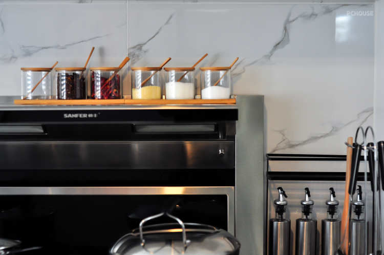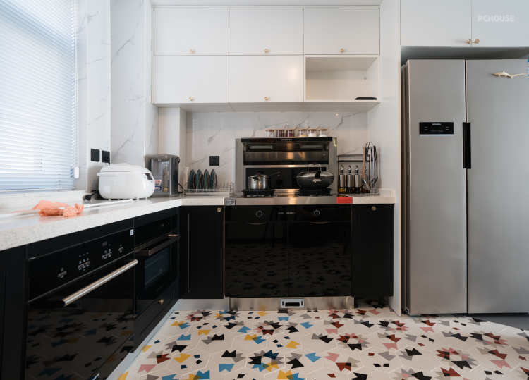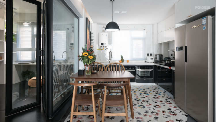 餐桌靠左边的玻璃隔断摆放,大件厨房电器靠右侧嵌入,预留中间位置,释放厨房空间。