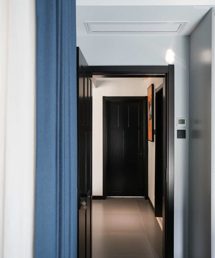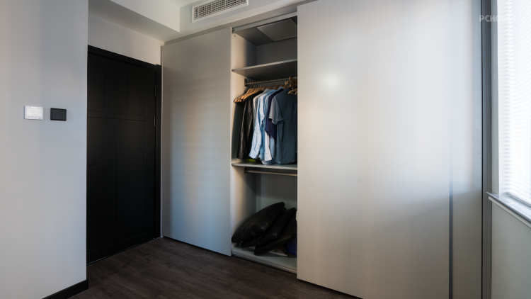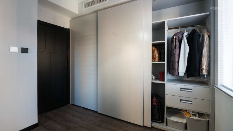 衣帽间采用黑色色调,衣帽间的门板的颜色选择上尽量接近与墙面的颜色,门板1000mm,可以尽可能的在视觉上做到隐形,扩大空间。
