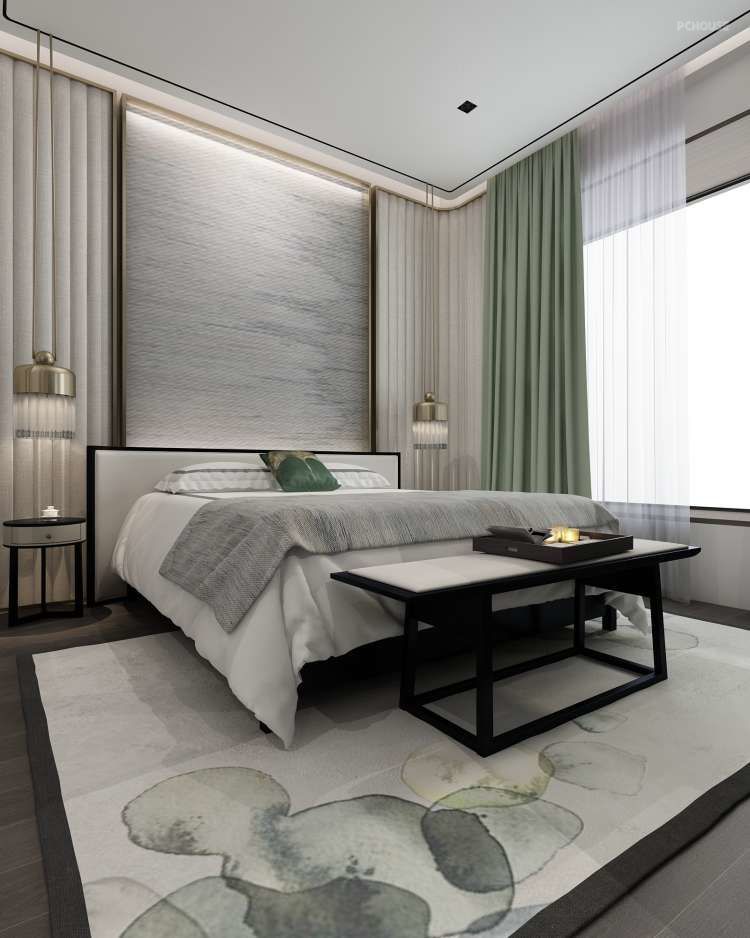 来到卧室,分为阅读区和休息区,休息区背景墙采用丝质的抽象写意的山水画,圆弧的波形软包墙弱化了空间的界限,浓郁的东方文化气息。