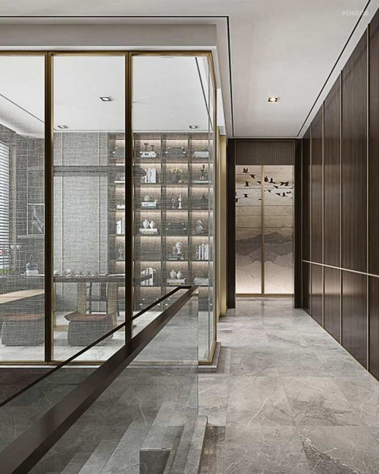 温润的石材、大理石台阶、雅致的木饰面、铜条,中国传统锁扣,麻布饰面,均以自然质朴的状态,无一不是呈现返璞归真的空间。