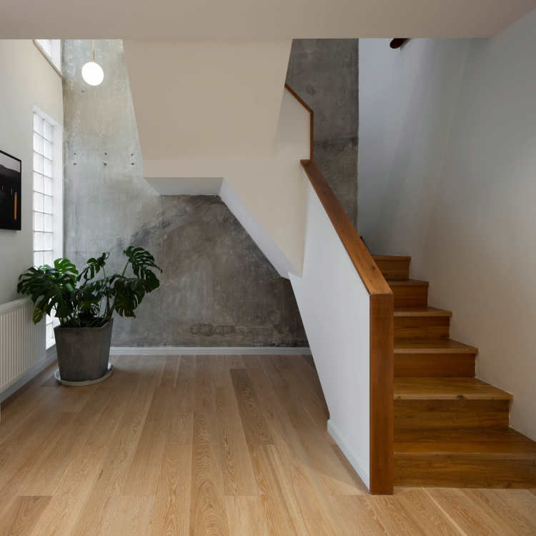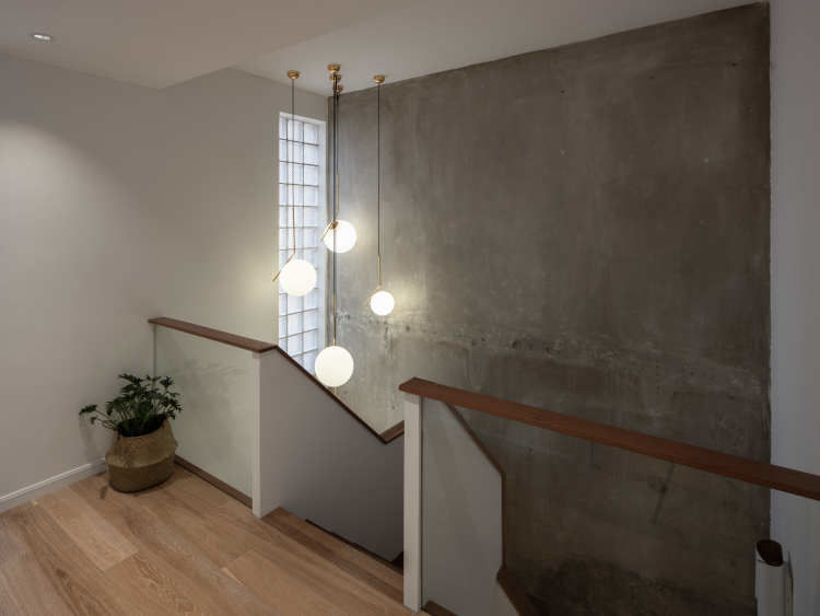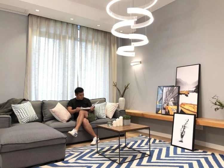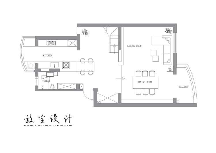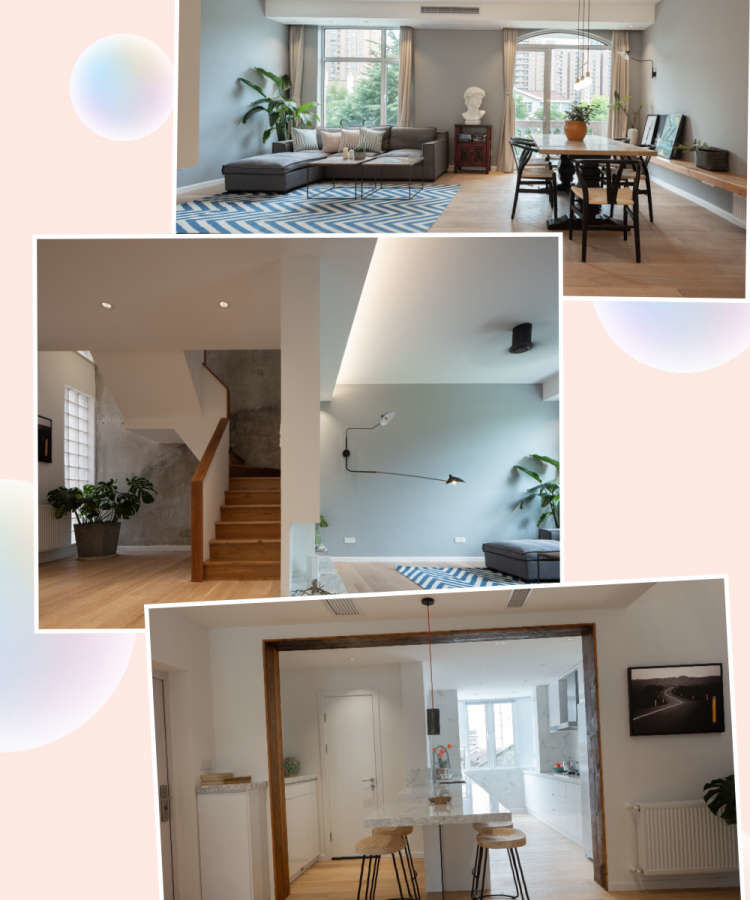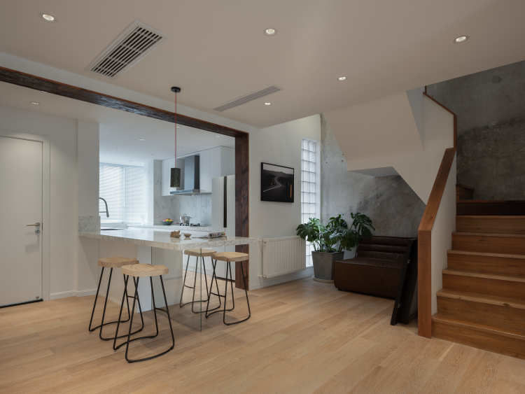 厨房与客厅的部分被中间的楼梯一分为二整体的设计,呈现出浓郁的北欧风情