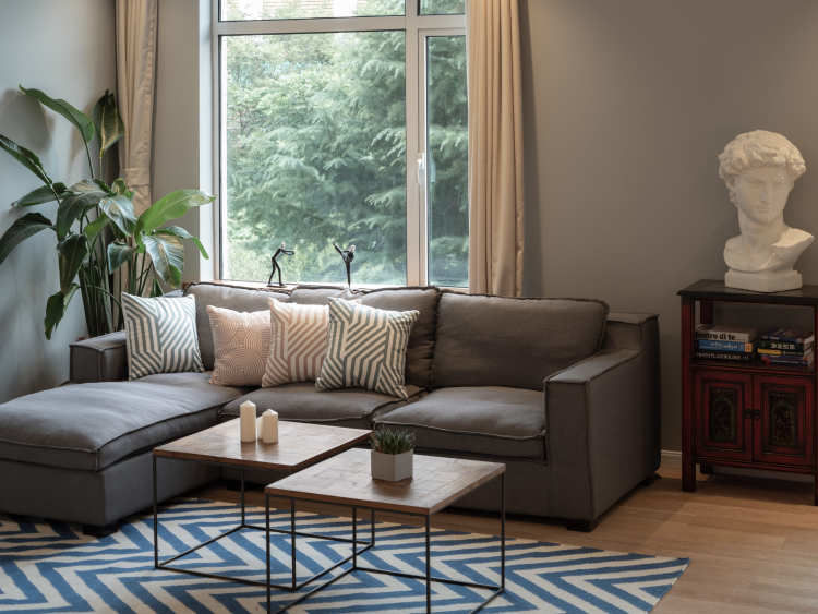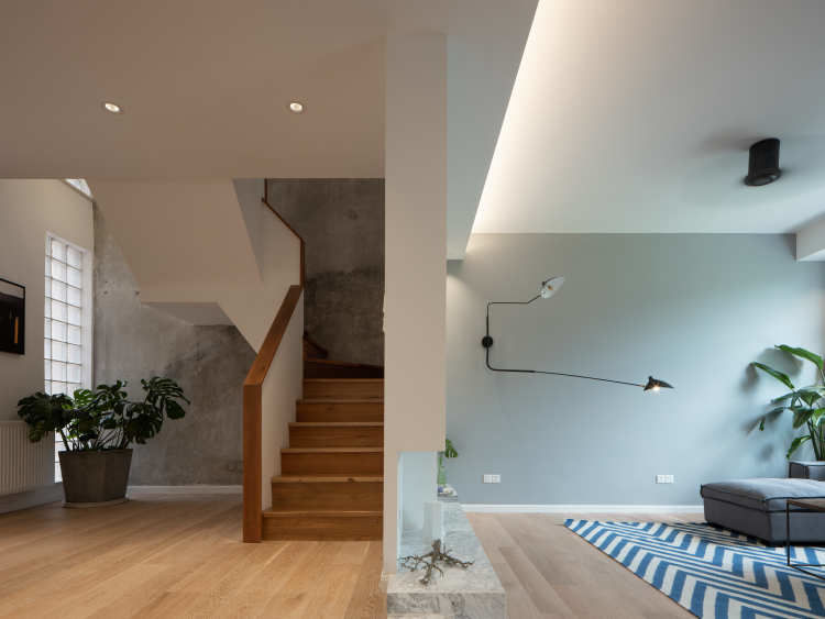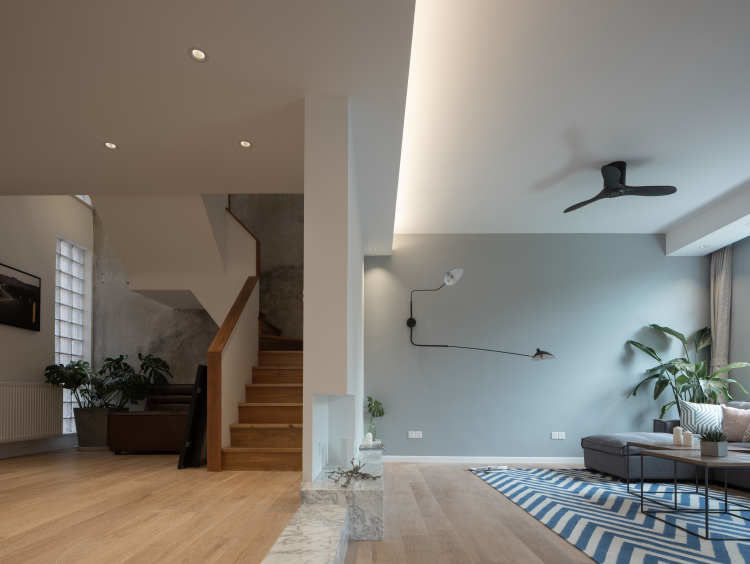楼梯的另一面则是家中的客厅区域蓝白相间的地毯与传统的老式书柜奠定了客厅的整体色调体系