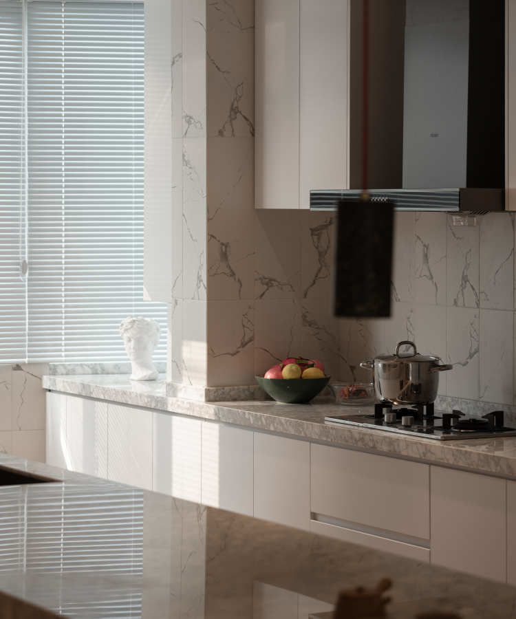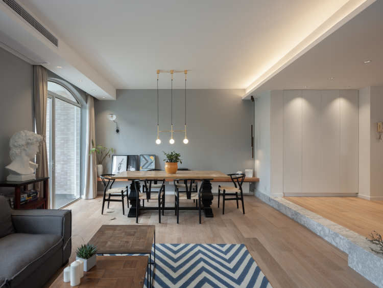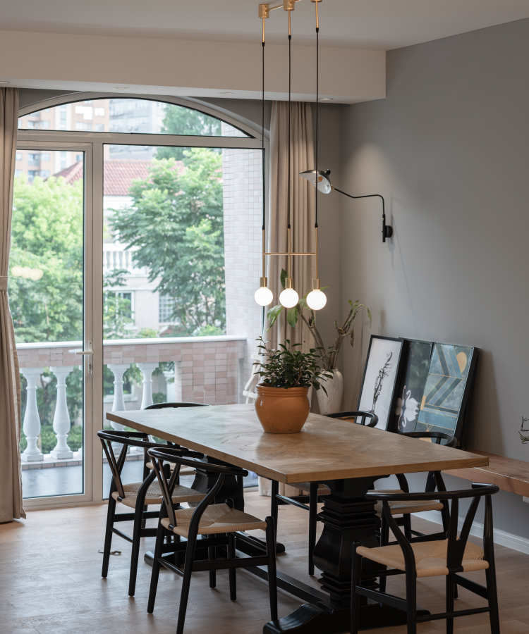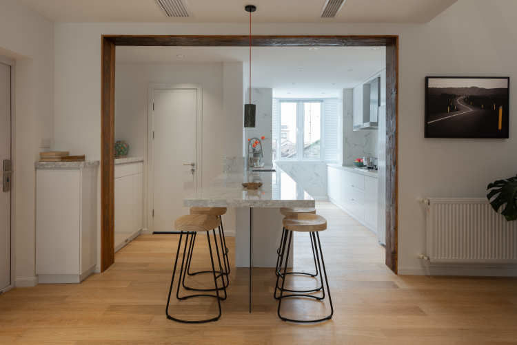 改造后的厨房门框的内表皮是设计的一大亮点从岛台区延伸而来的餐桌呈现了对称式的布局