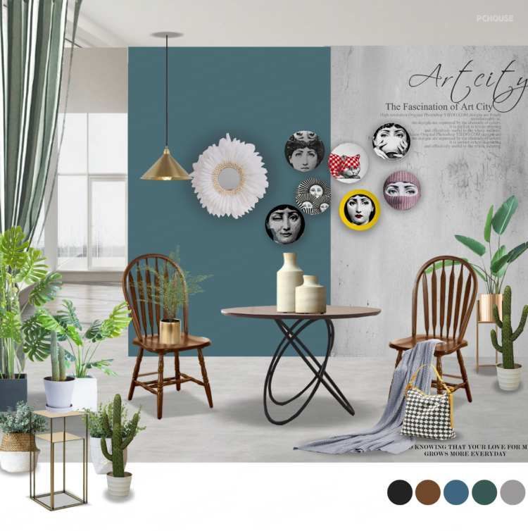 餐桌基本满足业主日常用餐即可,所以在不占用空间的基础上选了一款80公分的圆桌。手工编织的羽毛装饰镜是业主从土耳其带过来的,诙谐的装饰盘是业主对生活态度的反应,生活需要幽默。