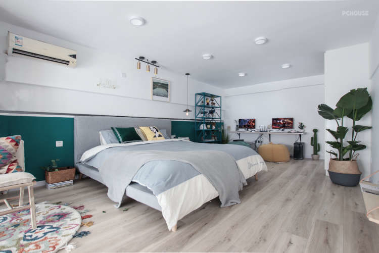 二楼层高比较矮,选用筒灯替换主灯形式,卧室和娱乐区没有做隔断,尽量使空间显得通透。