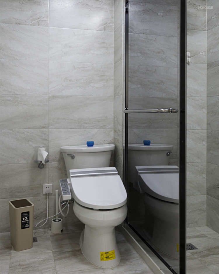 卫生间采用干湿分离,内部男主人为了追求品质生活,定制了防雾镜面淋浴房和智能马桶盖,视野开阔,搭配了浅咖色墙地砖。