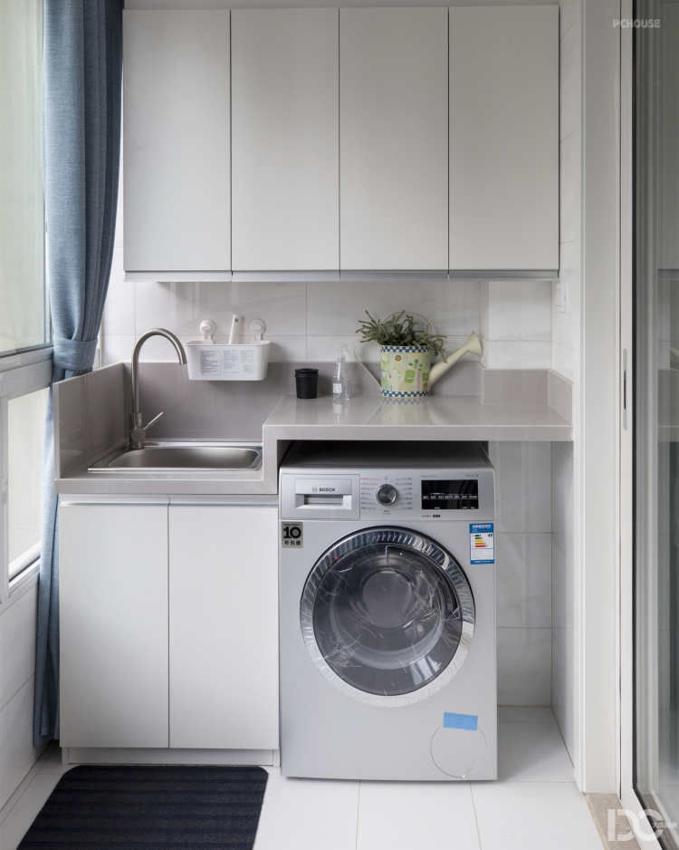 干区部分和厨房设计统一,颜色选用白色为主,led背光防雾镜柜,美观兼储物双管齐下,台上盆显得相得益彰,清洁上也是能做到无死角。