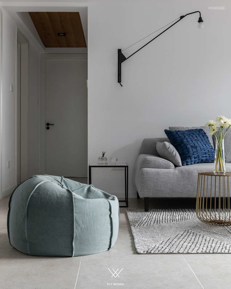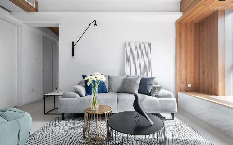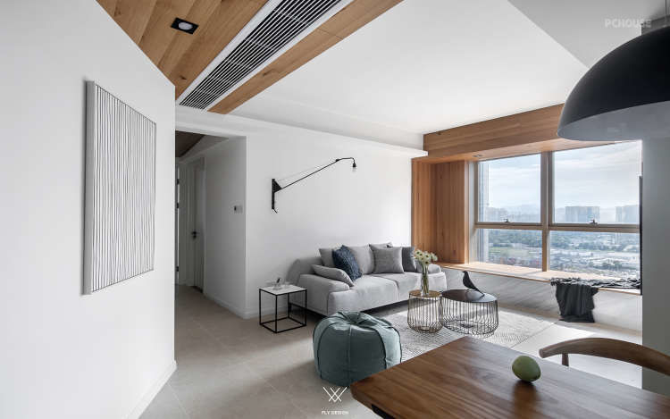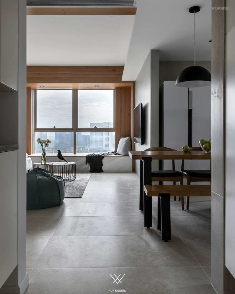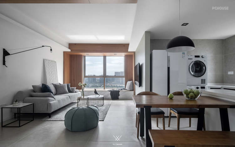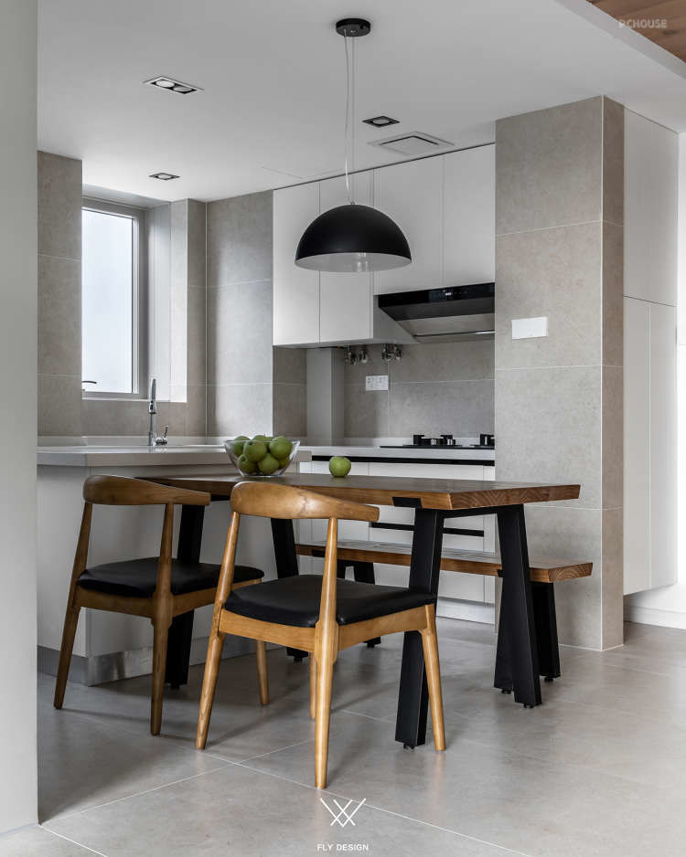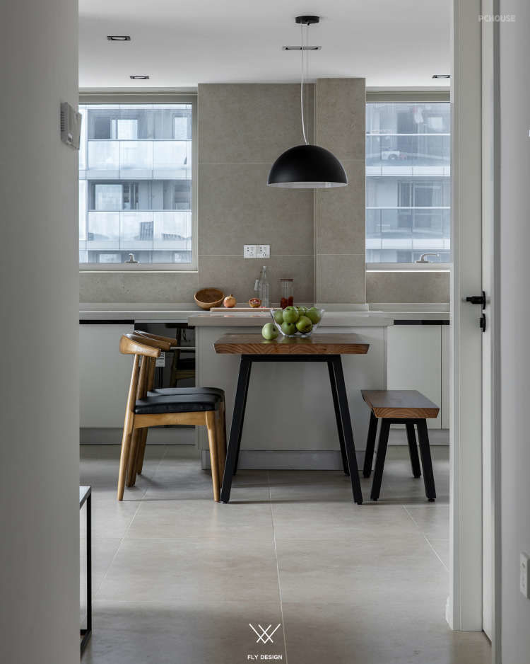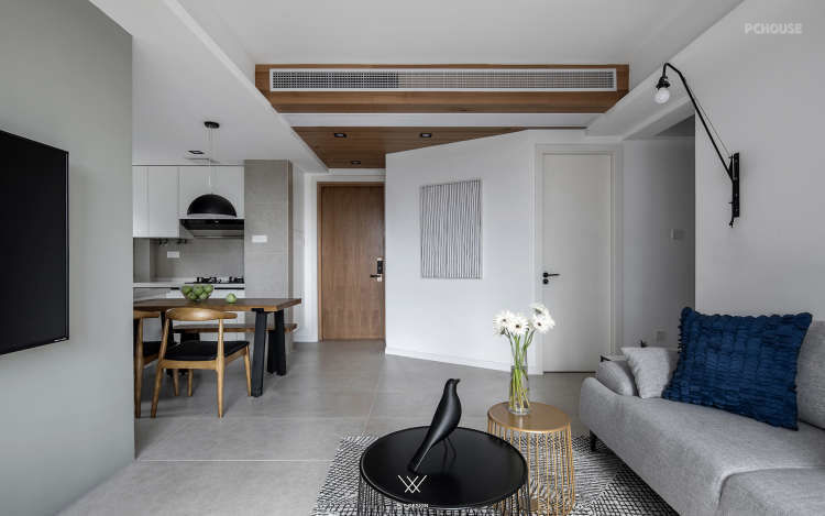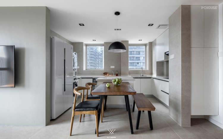 可以看到设计师把原本在厨房中间的墙体打掉,让厨房面积变大,形成了这样的开放式厨房。为了增加空间的利用率,餐厅区域和厨房区域是一体的。增加室内的储物空间在玄关处设置了一个墙面为斜面的储藏室,在通过玄关处进入客厅区域这种空间的变化让客厅变得宽敞。