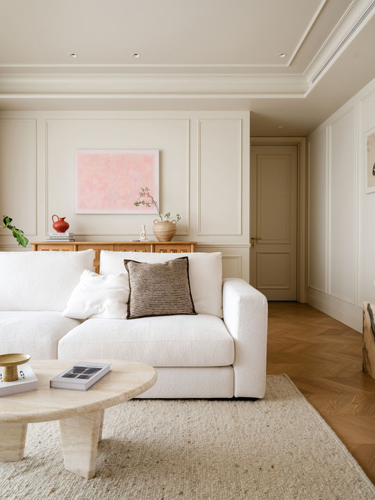 延伸到客厅的电视墙是用长条形乳白色木板拼接而成的,错分的格子,电视墙通高到顶,这使客厅的存储面积大大增加,靠近玄关的这侧的电视墙侧边并没有直接用木板封死,而是打造出了一个一个小格子,便于置物。电视墙是后期定制安装的,所以要记住在厂家复尺阶段,一定要注明未来电视的安装尺寸和其他预留位置的大小,留出背板开口,做好预判。