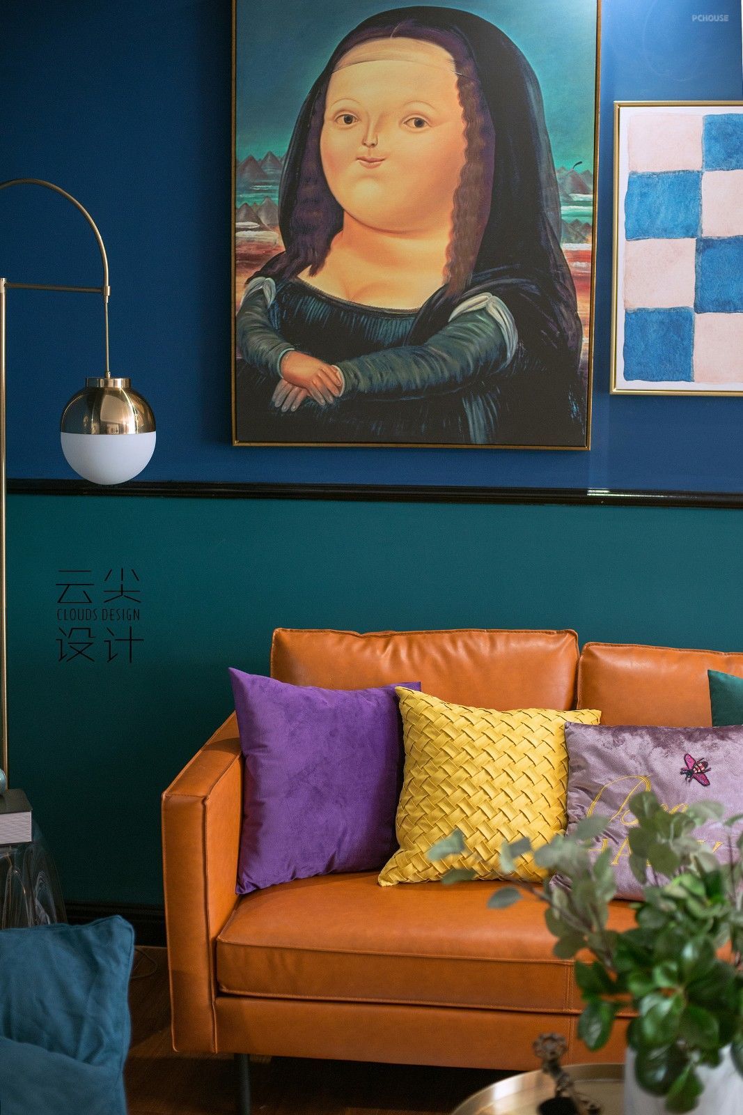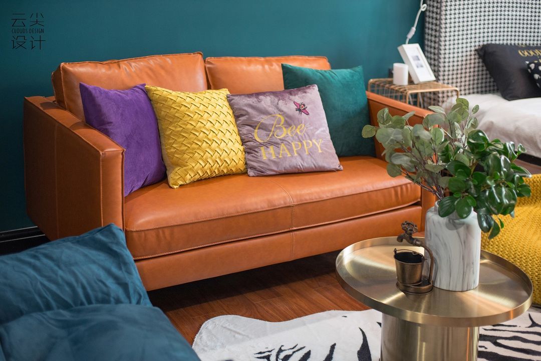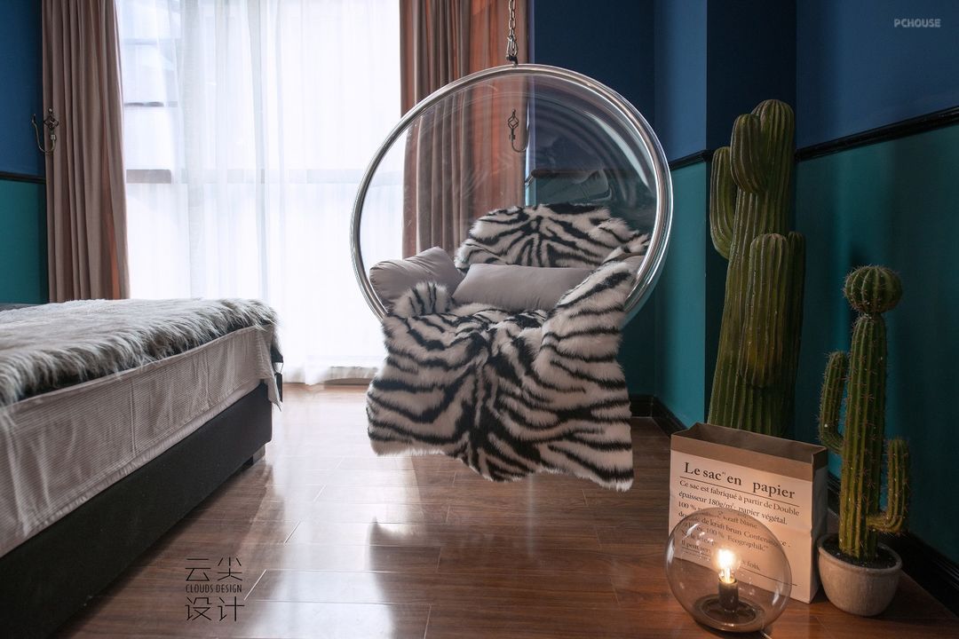 软装造型上全部使用的有棱角造型搭配圆形茶几吊椅。做到方圆结合。