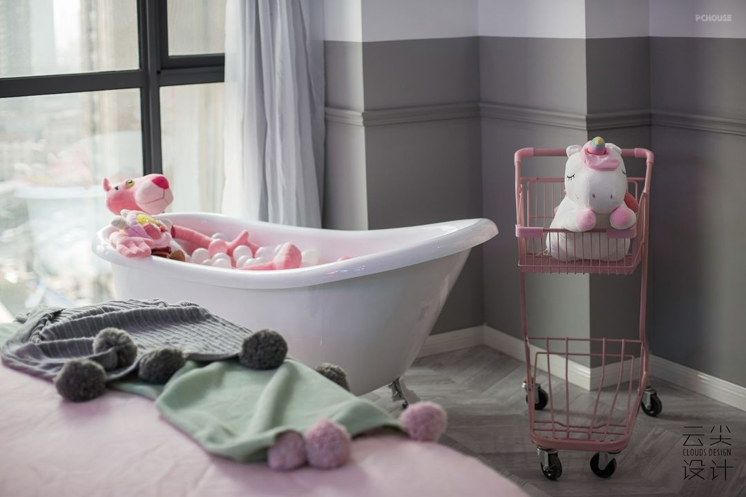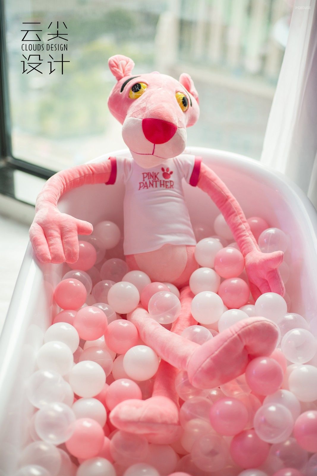 大大的床边浴缸填充柔软海洋球,粉红豹陪你一起“泡澡”