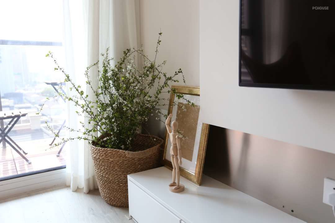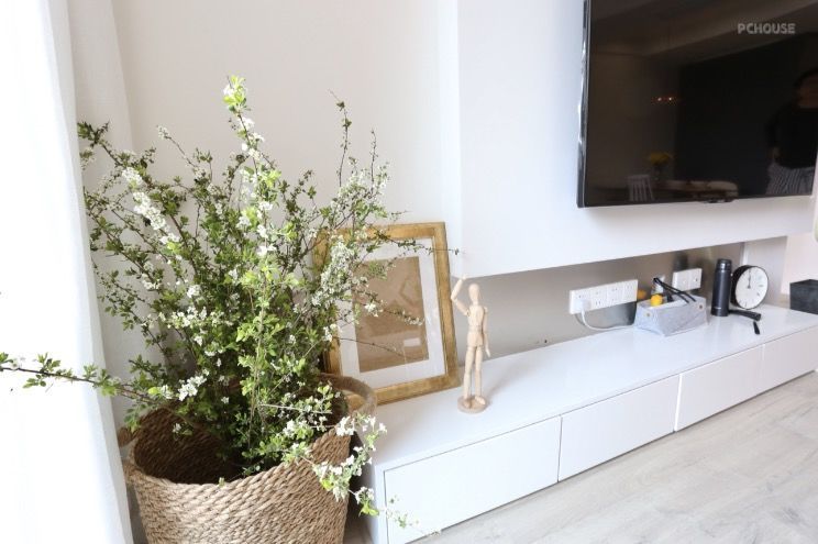 空调,背景墙也没过多设计,因为沙发对应的电视墙比较短,沙发位置比较居中,电视机位置不能居中,所以电视墙挂电视机的区域加出来8公分凸起。凸起左边用了一盏壁灯调剂这面墙的比例体量感,凸起下方贴了一块不锈钢板使整个电视墙不至于那么轻飘飘。最下方做了一排抽屉平台,很实用。