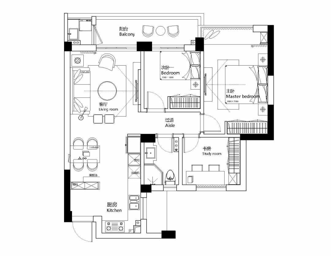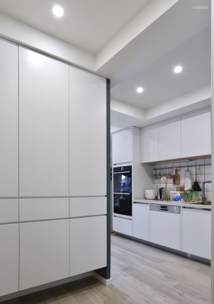 原户型是常规的小三房,客厅、主卧、次卧朝南,原厨房处较暗,考虑他们的生活习惯设计了开放式厨房,增加厨房台面,本来无法放置的烤箱高柜和洗碗机得到了解决。进门处增加了一堵鞋柜墙,一览无余的餐厅客厅得到了遮挡。其他空间没有调整。
